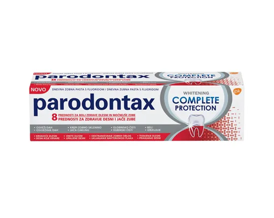 Pasta de dinti parodontax Complete Protection Whitening ajuta la mentinerea gingiilor sanatoase si a dintilor puternici avand 8 beneficii special concepute in acest sens. Mai mult, ajuta la redarea albului natural al dintilor prin indepartarea delicata a petelor de pe suprafata acestora.