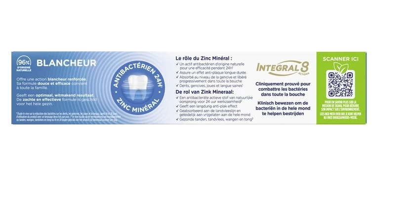 8 beneficii: protecție împotriva cariilor, protecție împotriva plăcii bacteriene, prevenire a tartrului, albire, protecție a smalțului, protecție a gingiilor, sensibilitate redusă, respirație proaspătă. Conține minerale de zinc. Efect antibacterian timp de 18 ore. Oferă un efect de albire îmbunătățit. Formula sa delicată și eficientă este potrivită pentru întreaga familie.
