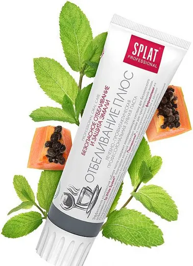 Pasta de dinți de albire SPLAT Whitening conține sistemul inovator Sp.White System® pentru o albire sigură, ceea ce o face potrivită chiar și pentru smalțul sensibil. Particulele rotunjite de lustruire combinate cu Polydon® și enzimele naturale de papaya iluminează vizibil smalțul, sparg placa bacteriană în zonele greu accesibile și lasă dinții perfect netezi, ajutând la menținerea albului pe termen lung.