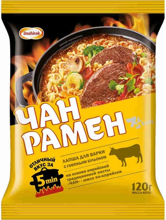 Tăieței instant Doshirak coreeni cu condimente Chang ramyun. Bulion pe bază de pastă tradițională coreeană Dan Chan.