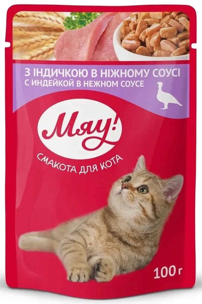 Descriere Hrană umedă pentru pisici Meow Curcan în sos fraged 0.1kg