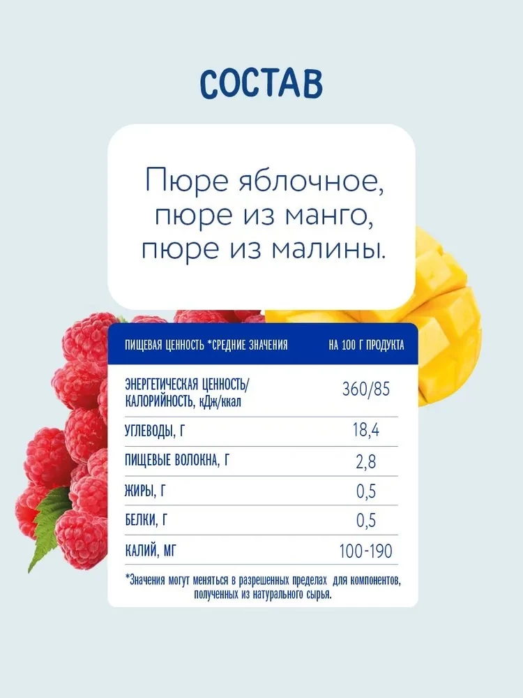 Ingrediente: piure de mere, piure de mango, piure de zmeură. Fabricat din piure concentrat.