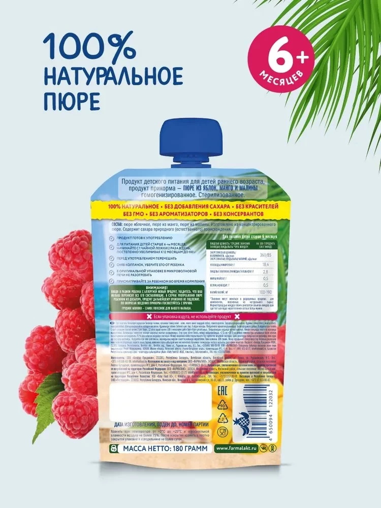 Ambalajul convenabil și modern - pungă, păstrează în totalitate proprietățile benefice ale fructelor, ocupă puțin spațiu în geantă și în frigider, este comod de luat pe drum și la plimbare! Piureul este produs în cea mai recentă fabrică modernă, în conformitate cu cerințele de înaltă calitate pentru alimente pentru copii.