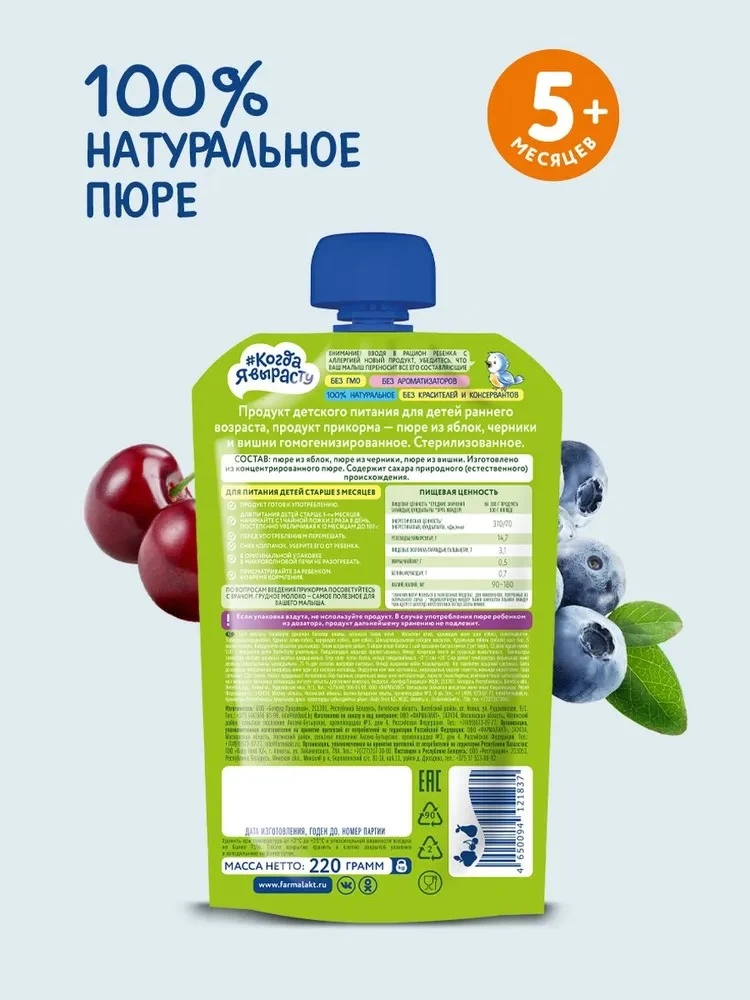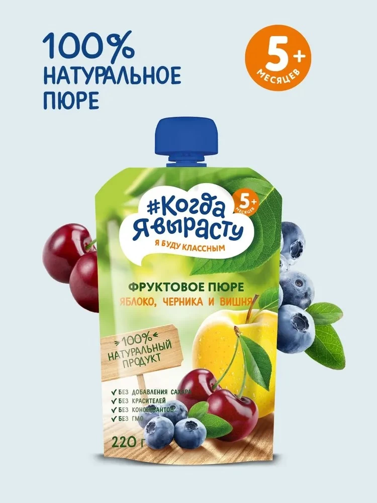Piureul de fructe "Măr, afine, cireșe" este un desert echilibrat și sănătos pentru bebeluși, recomandat pentru bebelușii cu vârsta de peste 5 luni.