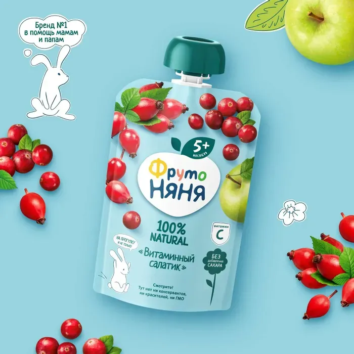 FrutoNyanya piure de mere, măceșe și merișoare îmbogățit cu vitamina C "salata de vitamine" pentru alimentația copiilor mici.