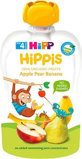 Piureul de fructe HiPP Apple Pear-Banana este 100% fructe într-un ambalaj convenabil, fără adaos de zahăr, fără îndulcire cu suc concentrat, fără coloranți, fără conservanți și fără arome. Se folosesc ingrediente produse organic, fără OMG-uri - organisme modificate genetic (în conformitate cu directivele UE privind produsele ecologice).