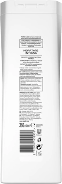 Cu niacinamidă și extract de cactus, șamponul antimătreață Clear Intense Hydration curăță și elimină eficient mătreața (până la 10 straturi în profunzimea epidermei) și hidratează intens pielea capului și părul.