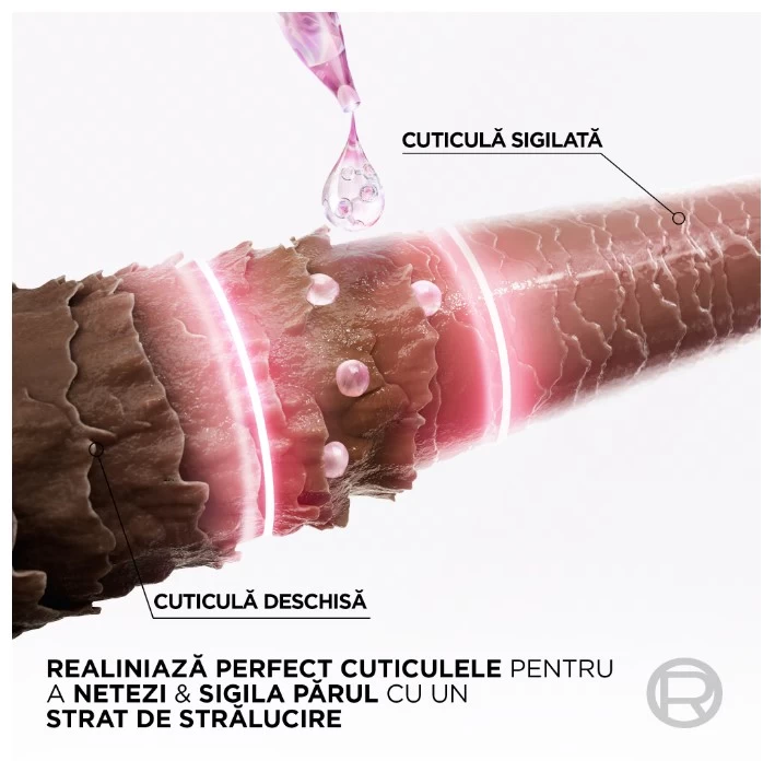 Parul sanatos este stralucitor pentru ca suprafata sa perfect neteda reflecta lumina. Dar parul deteriorat are cuticula neuniforma, ceea ce face ca fibra sa sa devina terna - si sa nu reflecte lumina. Prima noastra gama pentru efect de laminare acasa, imbogatita cu Acid Glicolic, restaureaza fibra din interior, pentru a imbunatati calitatea parului si a oferi o stralucire de durata. O transformare care rezista pana la 10 samponari.* Parul este cu 85% mai sanatos**; parul este cu 83% mai neted**.