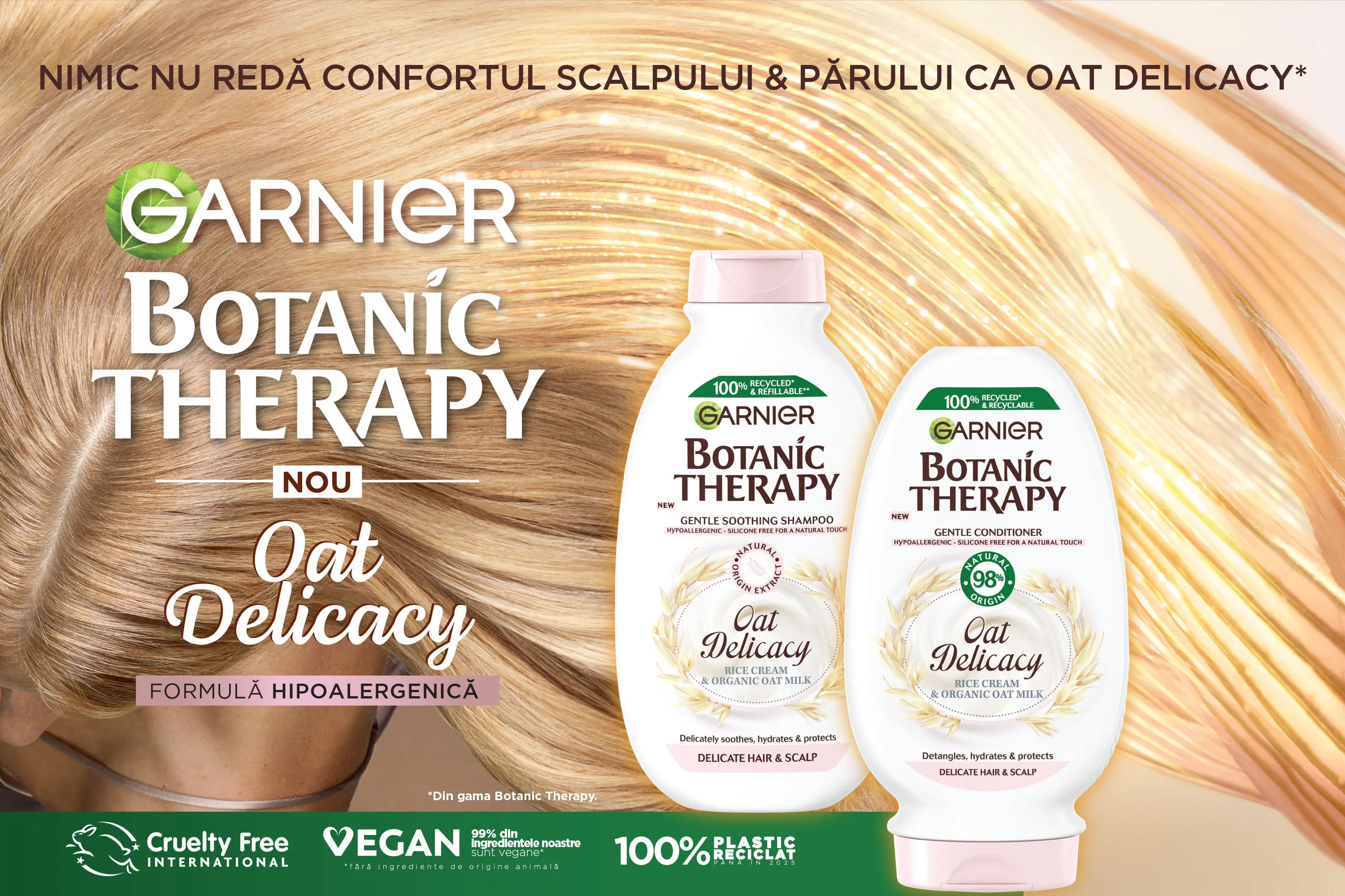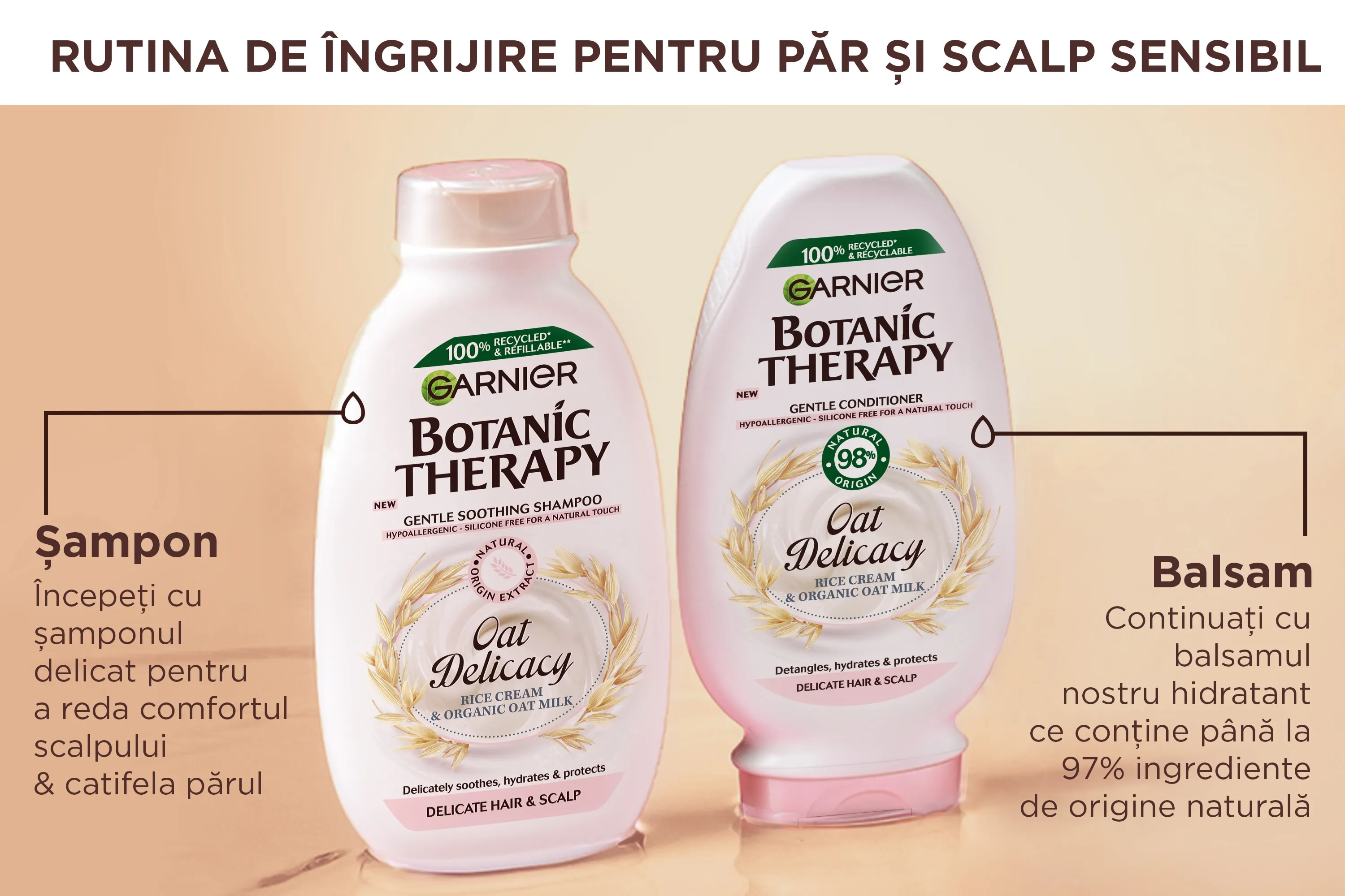 Sampon Garnier Botanic Therapy Rice Cream & Organic Oat Milk pentru par si scalp sensibil, 250 ml Samponul Botanic Therapy Rice Cream & Organic Oat Milk pentru par si scalp sensibil contine o formula imbogatita cu ingrediente naturale: complex de orez si lapte de ovaz organic.