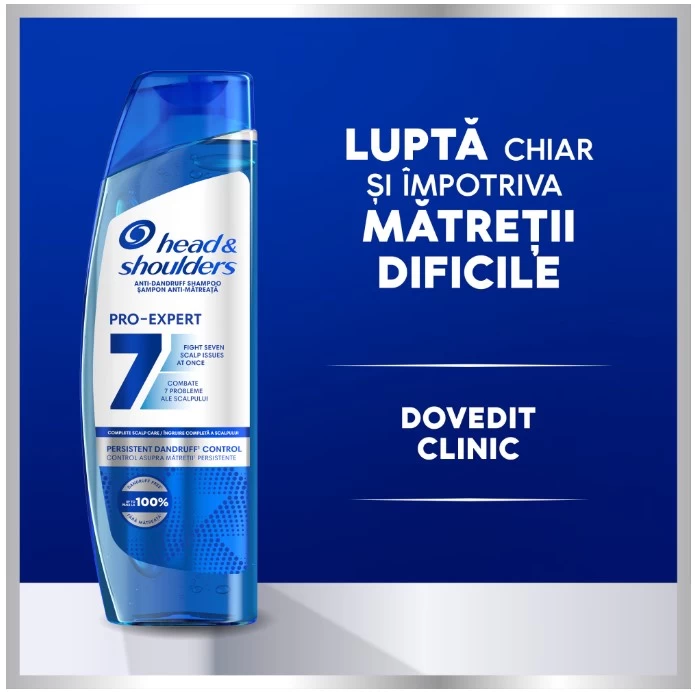Protectie maxima Head & Shoulders impotriva matretii. Formula Pro-Expert 7 are cele mai multe substante active impotriva matretii si combate 7 probleme ale scalpului pentru o protectie complete.