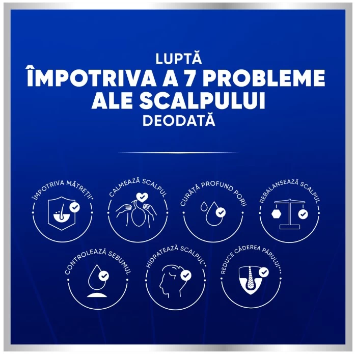 Protectie completa a scalpului intr-o singura sticla: 1. Combate matreata persistenta*, 2. Reechilibreaza scalpul, 3. Controleaza sebumul excesiv, 4. Curata porii in profunzime, 5. Combate mancarimile**, 6. Calmeaza scalpul, 7. Reduce caderea parului***