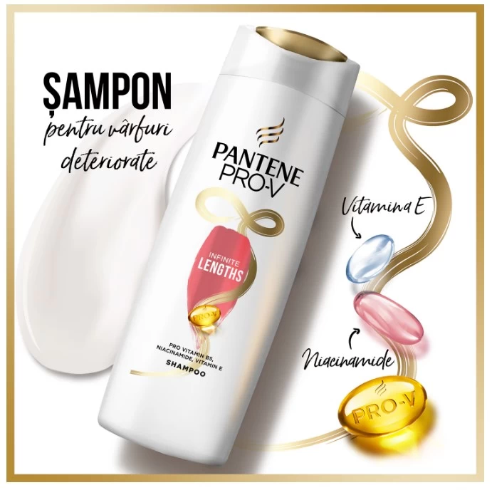 Samponul Pantene Pro-V Infinite Lengths hraneste parul deteriorat mediu si lung pentru a ajuta la intarirea* lui. Repara parul deteriorat de la radacina pana la varfuri, prevenind in acelasi timp despicarea varfurilor, facandu-l sa arate vizibil mai sanatos
