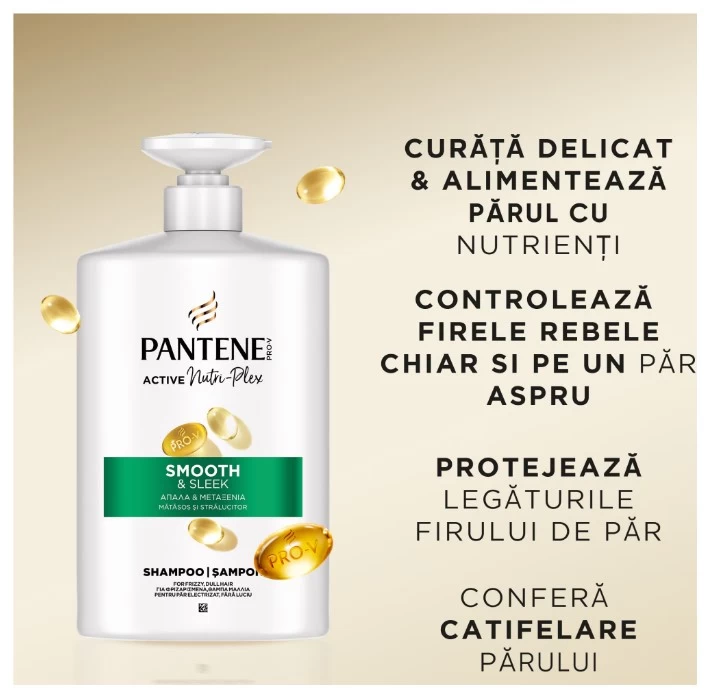 Protectia legaturilor din structura firului de par: cu formula Pro-V si tehnologia Active Nutri-Plex, samponul Pantene Pro-V Smooth & Sleek este conceput pentru a proteja structura parului si pentru a controla efectul de electrizare, chiar si pe parul lipsit de stralucire.