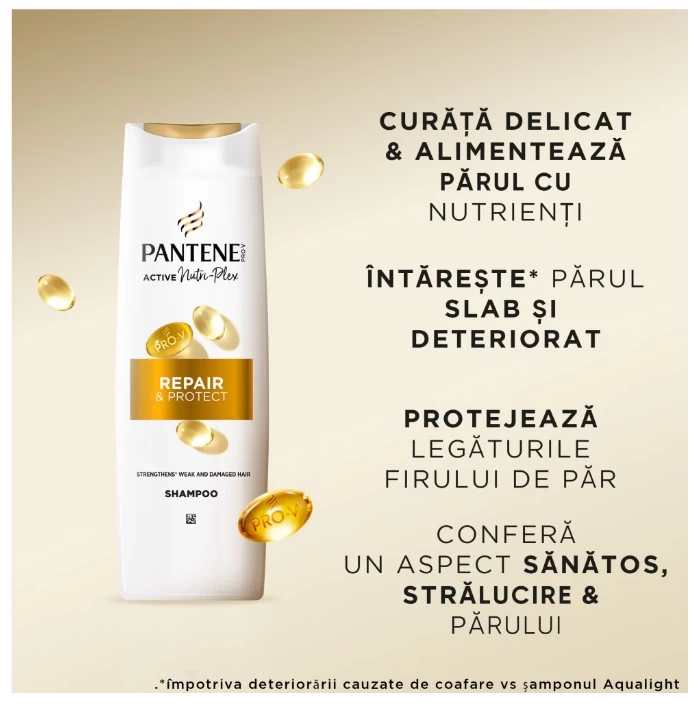 Descopera samponul Pantene Repair & Protect, sursa suprema de hrana si protectie pentru parul tau. Formula noastra delicata, cu PRO-V si tehnologia inovatoare ACTIVE NUTRI-PLEX, curata parul si il hraneste cu nutrienti esentiali. Atunci cand este folosit impreuna cu balsamul nostru, ajuta la repararea* semnelor de deteriorare, cum ar fi lipsa catifelarii si a stralucirii, intarind** totodata parul de la interior.
