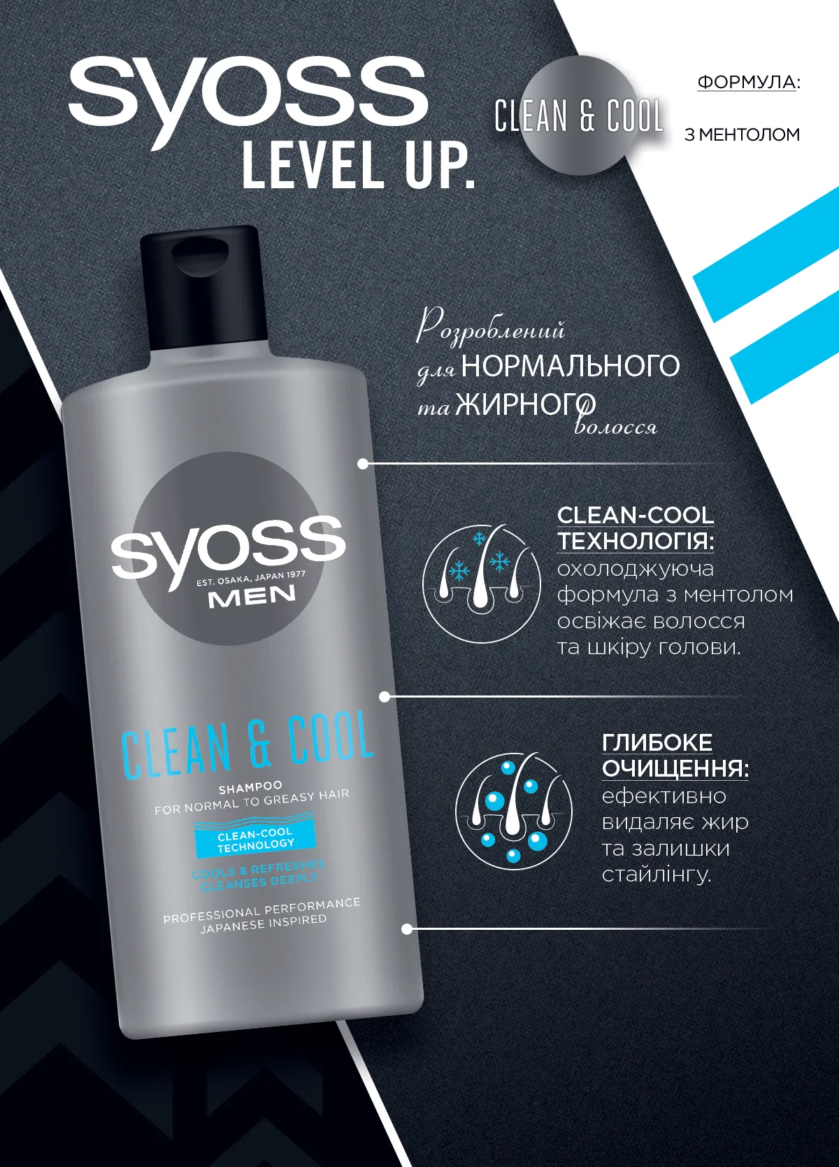Șamponul SYOSS Clean & Cool pentru bărbați cu mentol pentru păr normal până la gras împrospătează părul și scalpul.