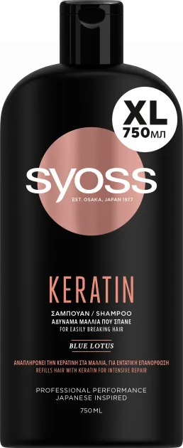 Șamponul SYOSS KERATIN Blue Lotus pentru păr fragil infuzează părul cu keratină pentru regenerare intensivă și netezime.