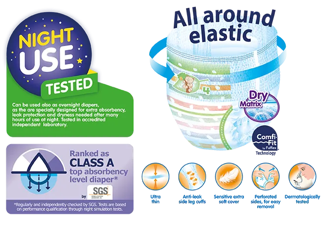 Datorită faptului că sunt certificați ca fiind prietenoși cu pielea, au o absorbție excelentă și datorită noii tehnologii "all around elastic", care oferă o elasticitate de 360ο în jurul taliei și picioarelor, aceștia se înfășoară în mod unic în jurul corpului bebelușului dvs. la fiecare mișcare, menținând scutecul în siguranță la locul lui și împiedicându-l să iasă afară.