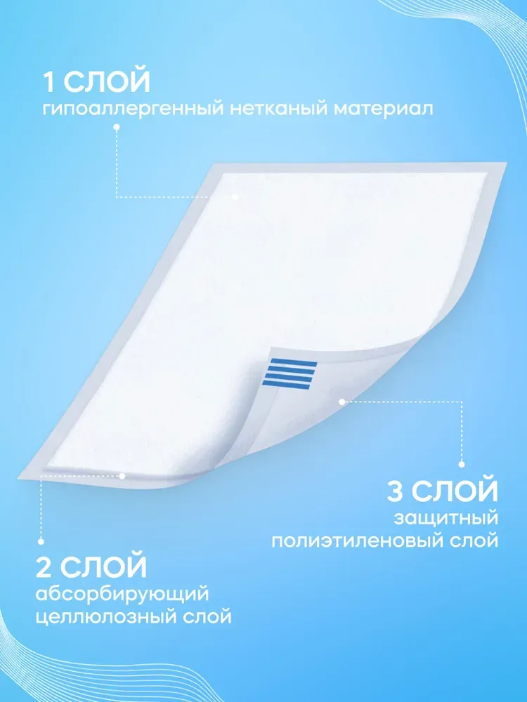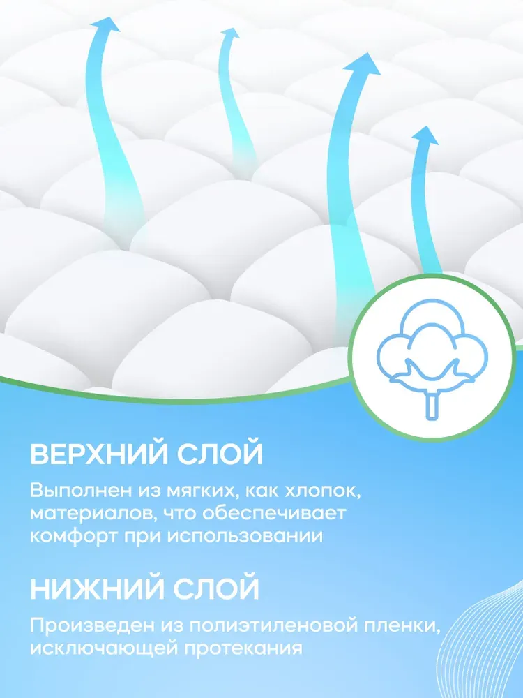 Este un material natural hipoalergenic. Stratul superior moale este realizat din țesătură nețesută hidrofilă, iar stratul inferior este realizat din folie de polietilenă albă durabilă. Poate fi folosit ca lenjerie de pat impermeabilă sau ca strat inferior deasupra unui cearșaf sau a unei saltele. Utilizare universală și concepută pentru prevenirea maximă a umezelii atunci când este folosită împreună cu scutece, chiloți absorbanți și tampoane urologice ca tampoane auxiliare.