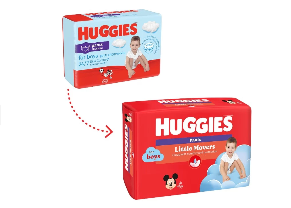 Intr-un nou pachet rosu uimitor, scutecele preferate Huggies® Pants devin acum Huggies® Little Movers – mai moi si cu o protectie si mai buna.