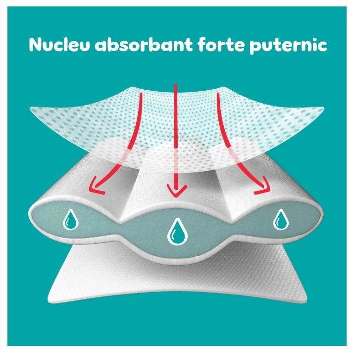Nucleu absorbant foarte puternic absoarbe lichidul instantaneu pentru o protectie de jur-imprejur de pana la 12 ore.