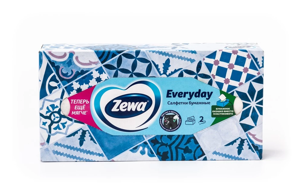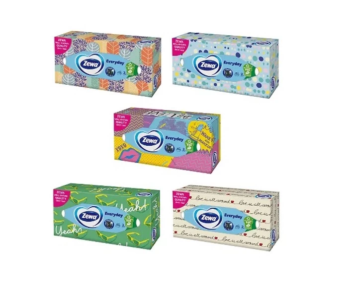 Șervețelele de hârtie Zewa Everyday Paper Wipes sunt fabricate din fibre naturale de bumbac și combină moliciunea și durabilitatea în același timp. Acestea îngrijesc delicat pielea și oferă o atingere de bumbac de neuitat. Șervețelele de hârtie Zewa, în cutie cu design colorat, sunt ideale pentru a fi folosite acasă sau la serviciu. Ele vă vor "salva" nu numai în timpul răcelilor, ci și în activitățile de zi cu zi, atunci când trebuie să vă ștergeți mâinile sau fața, să vă corectați machiajul. Șervețele de față albe, fără parfum, cu două straturi. 5 modele diferite de cutii. 100 de batiste într-o cutie.