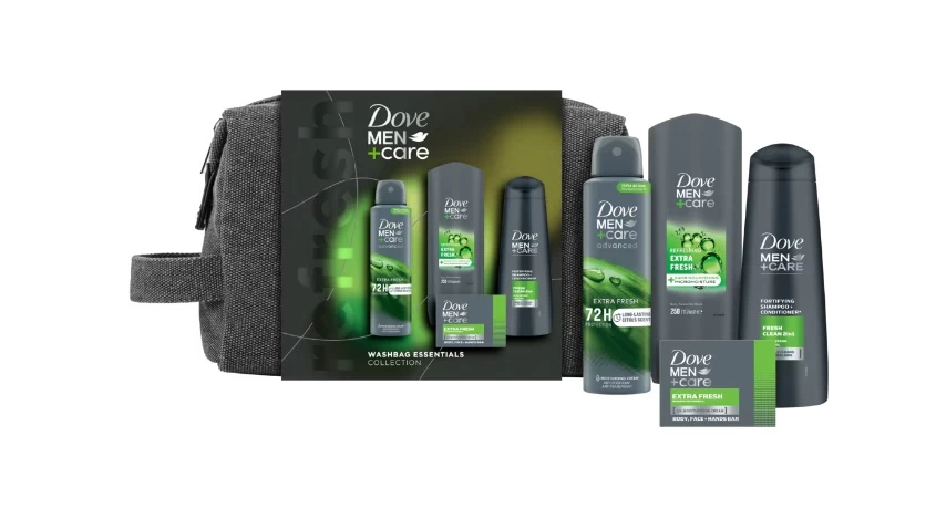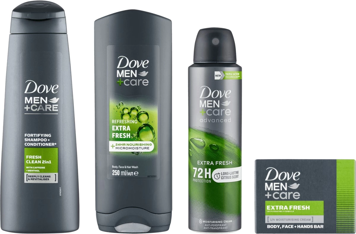 Set cadou Dove Men+Care Advanced: Spray Extra Fresh, 150ml + Gel de dus Dove Men+Care Extra Fresh, 250ml + Sapun crema Dove Men+Care Extra Fresh, 90g + Sampon Dove Men+Care Clean Fresh, 250ml