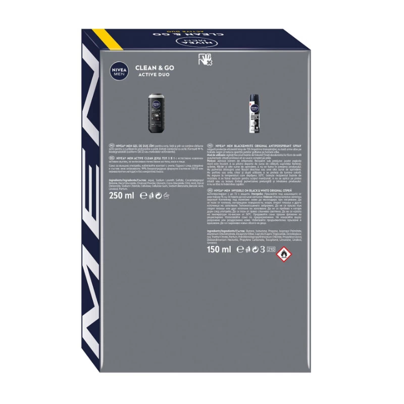 Daruieste-i un cadou irezistibil barbatului special din viata ta: setul NIVEA MEN CLEAN & GO: NIVEA MEN BLACK&WHITE INVISIBLE POWER Deodorant spray 150ml + NIVEA MEN ACTIVE CLEAN Gel de dus 250ml.