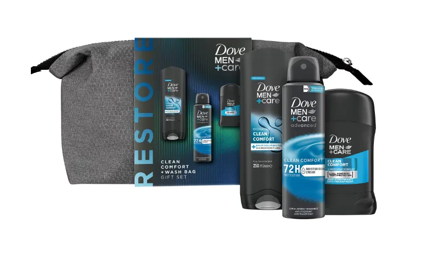 Rasfata-te pe tine si pe cei dragi cu setul cadou Dove Men+Care: Gel de dus Dove Men+Care Clean Comfort 250ml + deodorant Dove Men+Care Clean Comfort 150ml +deodorant Dove Men+Care stick Clean Comfort + geanta cadou