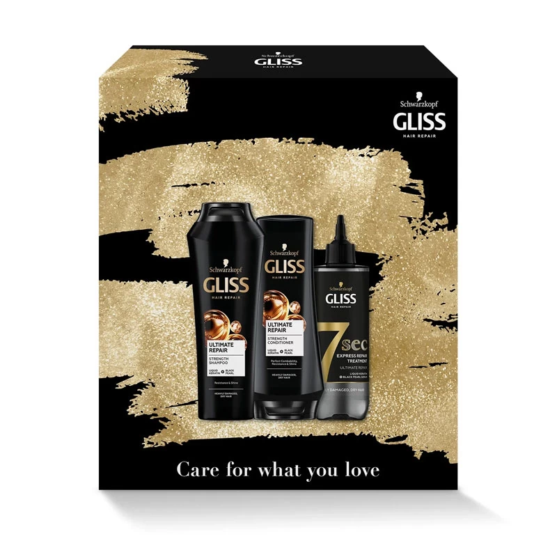 Set cadou Gliss Ultimate Repair pentru par deteriorat si uscat: Sampon 250ml, Balsam 200ml si Tratament Express 7 Secunde 200ml.