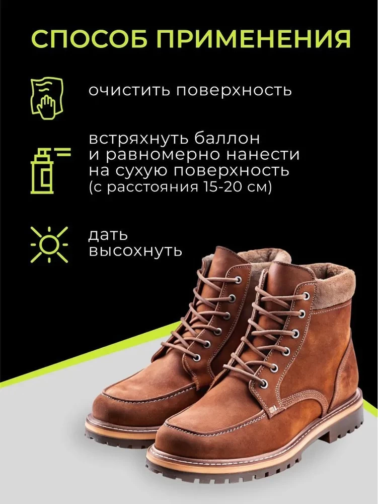 Țineți în poziție verticală, cu pulverizatorul în sus. Aplicați uniform produsul pe încălțăminte de la o distanță de 20 cm pe încălțăminte uscată, curățată cu spumă-curățător și tratată cu grijă.