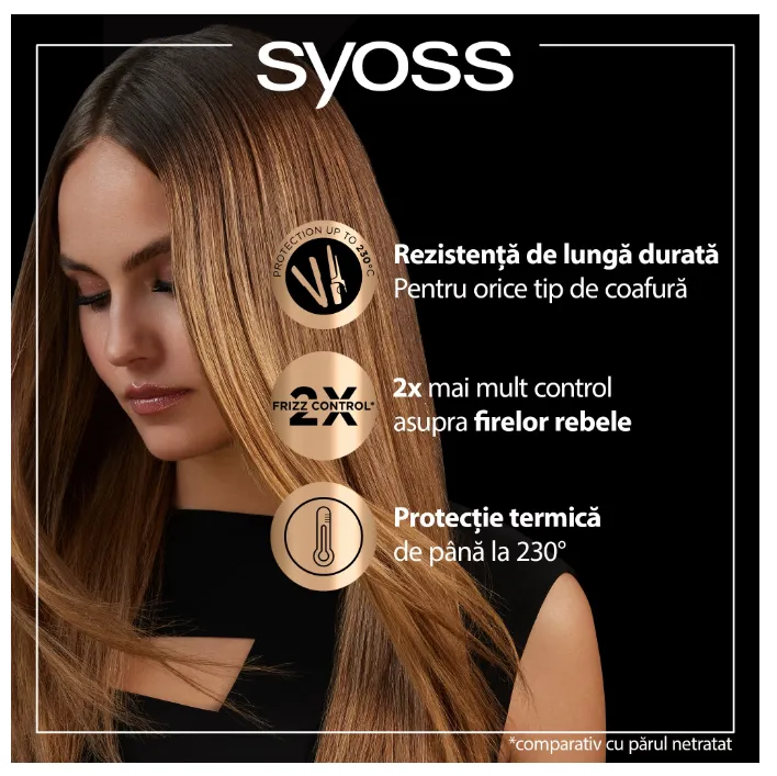 SYOSS contine componente de cheratina lichida identica parului, dezvoltat si testat impreuna cu stilistii pentru un par frumos ca la salon.