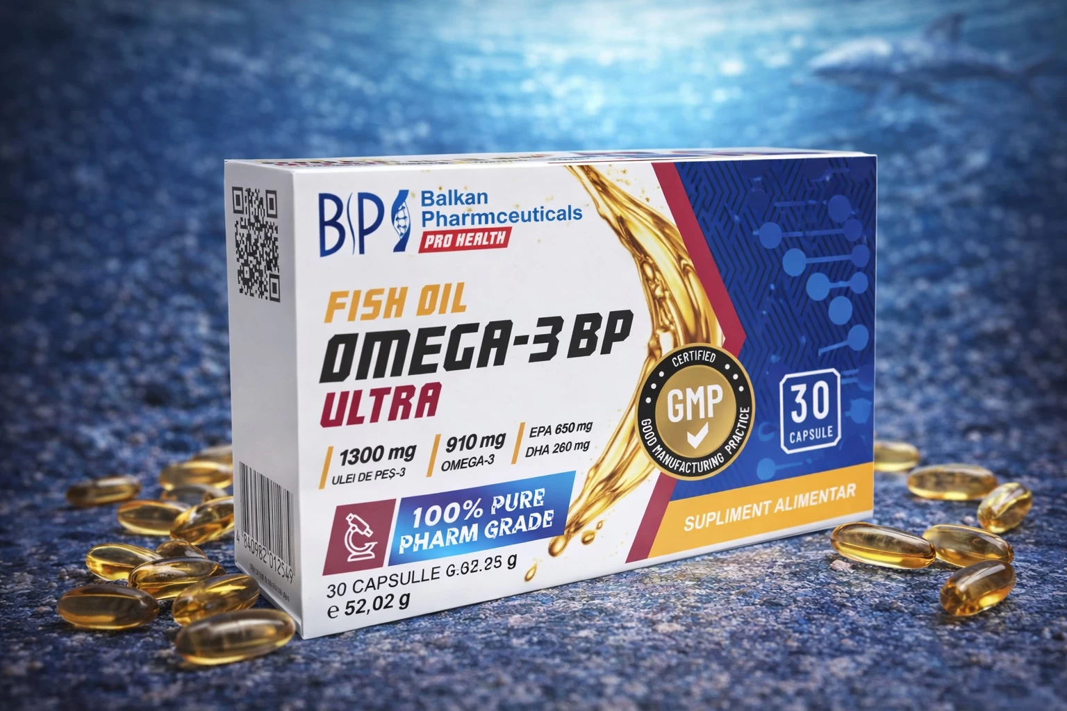 Suplimentul alimentar de înaltă calitate Omega-3 BP ULTRA de la Balkan Pharmaceuticals reprezintă un produs omega 3 mai bogat în acizi grași, ce conține doze ridicate de EPA (acid eicosapentaenoic) și de DHA (acid docosahexaenoic) pentru beneficii maxime. Este ajutorul perfect pentru creierul și inima Dvs. Forma sa uleioasă îi asigură o absorbție și biodisponibilitate crescută, pentru o dezintegrare mai bună a produsului și o livrare imediată a nutrienților.