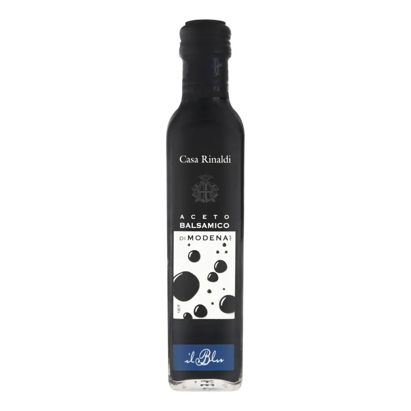 Oțetul balsamic de Modena cu etichetă albastră IGP Casa Rinaldi are o dulceață medie în rândul întregii game de oțeturi balsamice cu etichete colorate. Cel mai dulce oțet este cel cu eticheta roșie, cel mai puțin dulce cel cu eticheta neagră și cel cu dulceață medie cel cu eticheta albastră. Produsul are un gust delicat acrișor-dulce, cu o ușoară tentă lemnoasă, culoare brună și o aromă unică și rafinată.