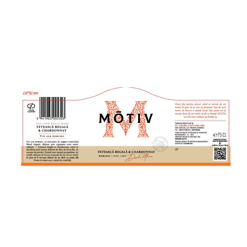 MOTIV alb demisec este un blend elegant, obtinut prin cupajarea unor soiuri rafinate - Feteasca Regala si Chardonnay. Aspectul limpede si cristalin, culoarea si gustul armonioase, bine evoluate, sunt tipice podgoriei.