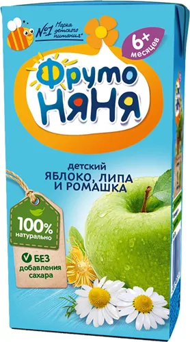 ФрутоНяня напиток сокосодержащий из яблок с экстрактами липы и ромашки неосветленный для питания детей раннего возраста.