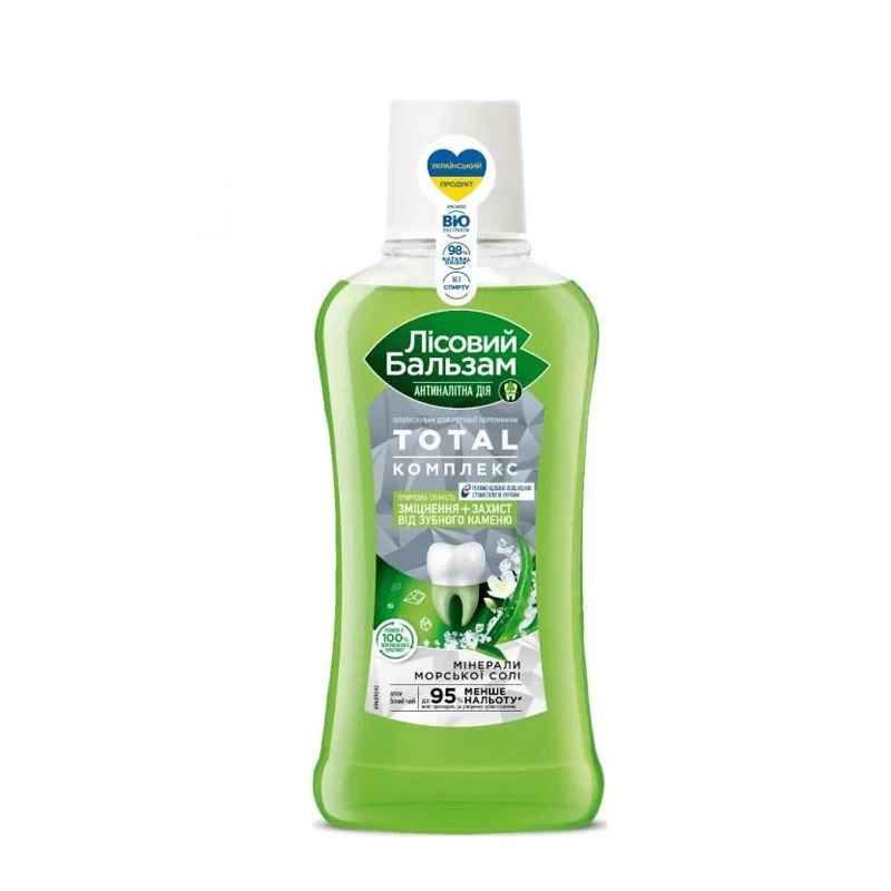 Формула ополаскивателя Лесной бальзам TOTAL Комплекс с морской солью, маслом мяты и экстрактами лесных трав эффективно борется с первопричиной развития серьезных проблем полости рта – зубным налетом, эффективно удаляет налет в труднодоступных для щетки местах, снижает скорость появления налета на зубах в течение дня, защищает от зубного камня, укрепляет зубы и десны.