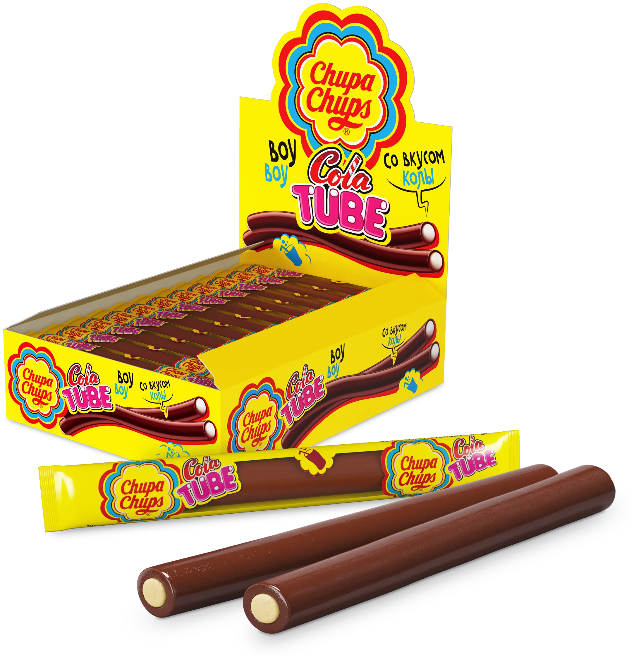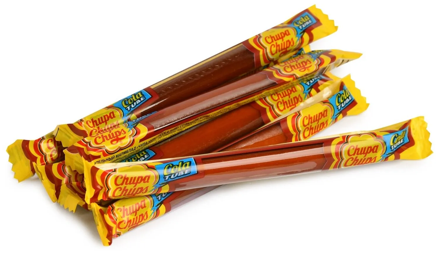 Жевательный мармелад Chupa Chups в форме трубочки со вкусом кока-колы и с лимонной начинкой.