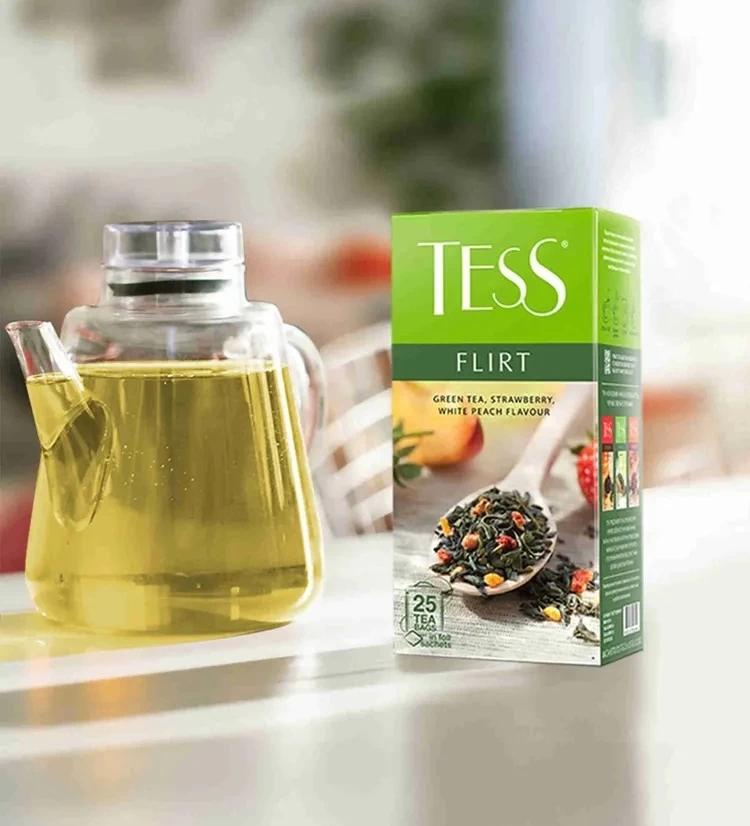 Чай зеленый Tess Flirt с клубникой и ароматом белого персика 25 пак – восхитительная композиция, которая непременно порадует любителей оригинальных сочетаний.