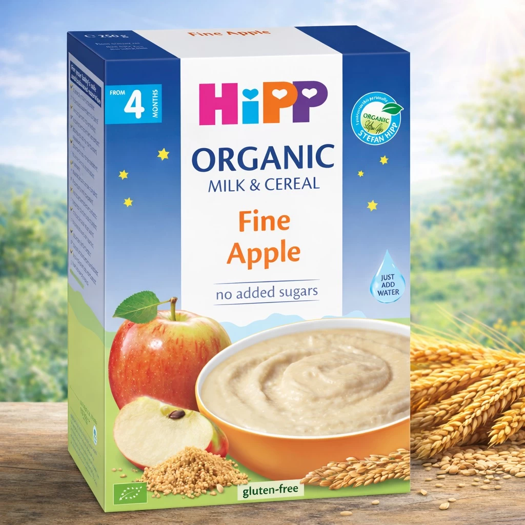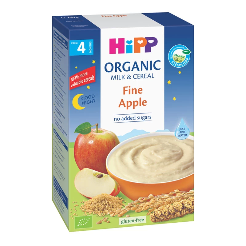 Органические компоненты, входящие в состав каши, являются гарантией экологической безопасности и высокой пищевой ценности продукта. Не содержит сахара и глютена. Обогащена сухим порошком из натуральных органических яблок. В качестве молочного компонента используется не сухое молоко, а органическая молочная смесь HiPP, что более безопасно и полезно для ребенка. Имеет нежный вкус, легко усваивается. Хлопья из цельных органических злаков обеспечивают особую сытность и питательность. Получив такую кашу на ужин, ребенок будет спокойнее спать всю ночь.