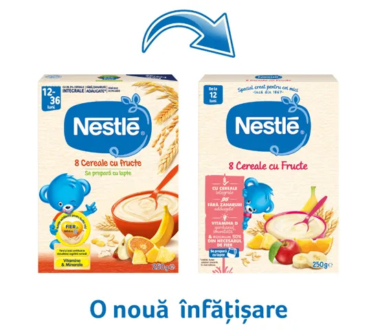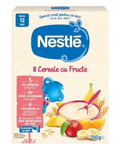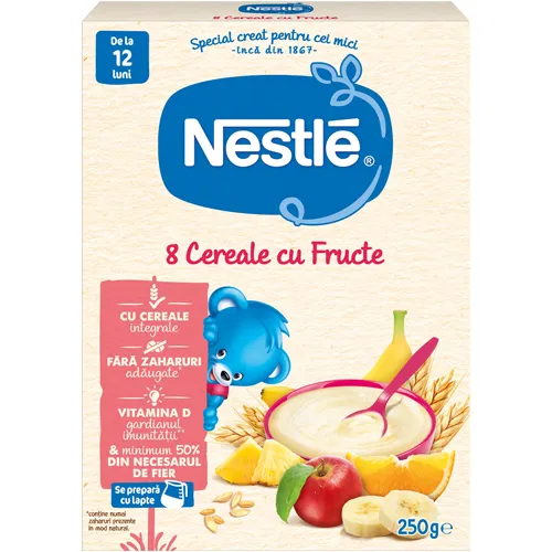 Предложите вашему цыпленку вкусную еду на основе зерновых (пшеница, кукуруза, рожь, ячмень, спельта, тритикале, рис, цельный овес) и фруктов (бананы, апельсины, ананас, яблоки), обогащенных необходимыми питательными веществами. Злаки "Нестле® 8 фруктов" просты в приготовлении и благодаря своей питательности, нежному вкусу и мягкой текстуре подходят для периода диверсификации. Каждая порция крупы Nestlé для малышей специально разработана для вашего ребенка, обеспечивая необходимыми питательными веществами для нормального роста и развития в порции, подходящей для маленького желудка вашего малыша. Специальные хлопья для малышей содержат железо, йод и витамин B1 для нервной системы и нормального когнитивного развития. Вашему ребенку требуется в 5 раз больше железа на килограмм массы тела, чем взрослому*, а одна порция в день хлопьев Nestlé® для малышей обеспечивает не менее 50% их потребности**. Кроме того, они содержат иммунонутриенты, такие как витамины A, C и D и цинк, которые помогают иммунной системе нормально функционировать. Крупы Nestlé® для малышей также являются источником кальция, который способствует нормальному росту и развитию костей у детей.