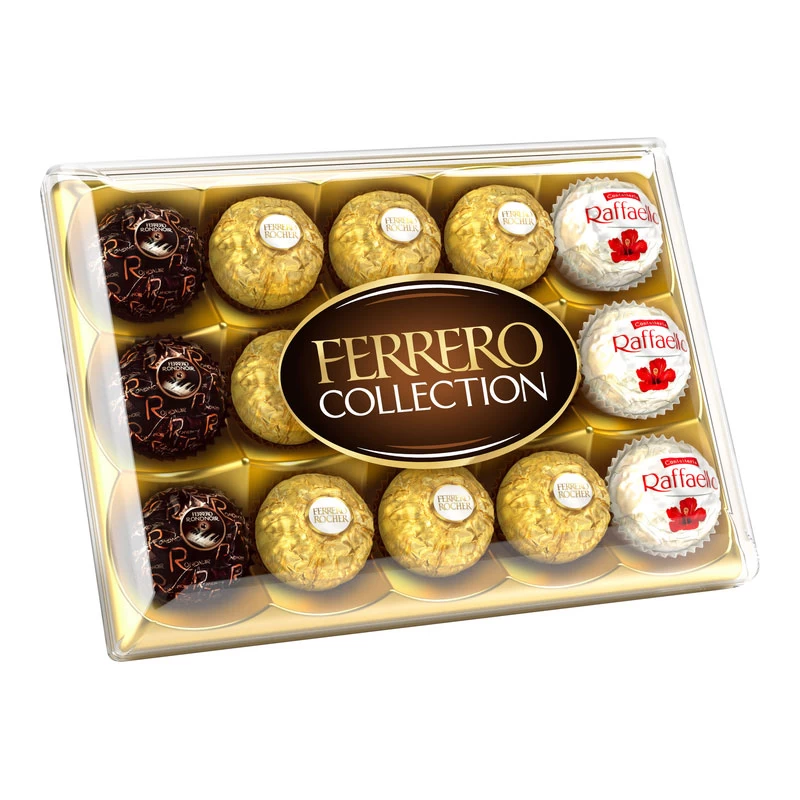 Ferrero Collection — коллекция трех совершенных вкусов Ferrero: сочетание лесного ореха и молочного шоколада в Ferrero Rocher, изысканный рецепт темного шоколада в Ferrero Rondnoir и нежный вкус кокоса в Raffaello. Содержит 9 конфет Ferrero Rocher, 3 конфеты Ferrero Rondnoir и 3 конфеты Raffaello.