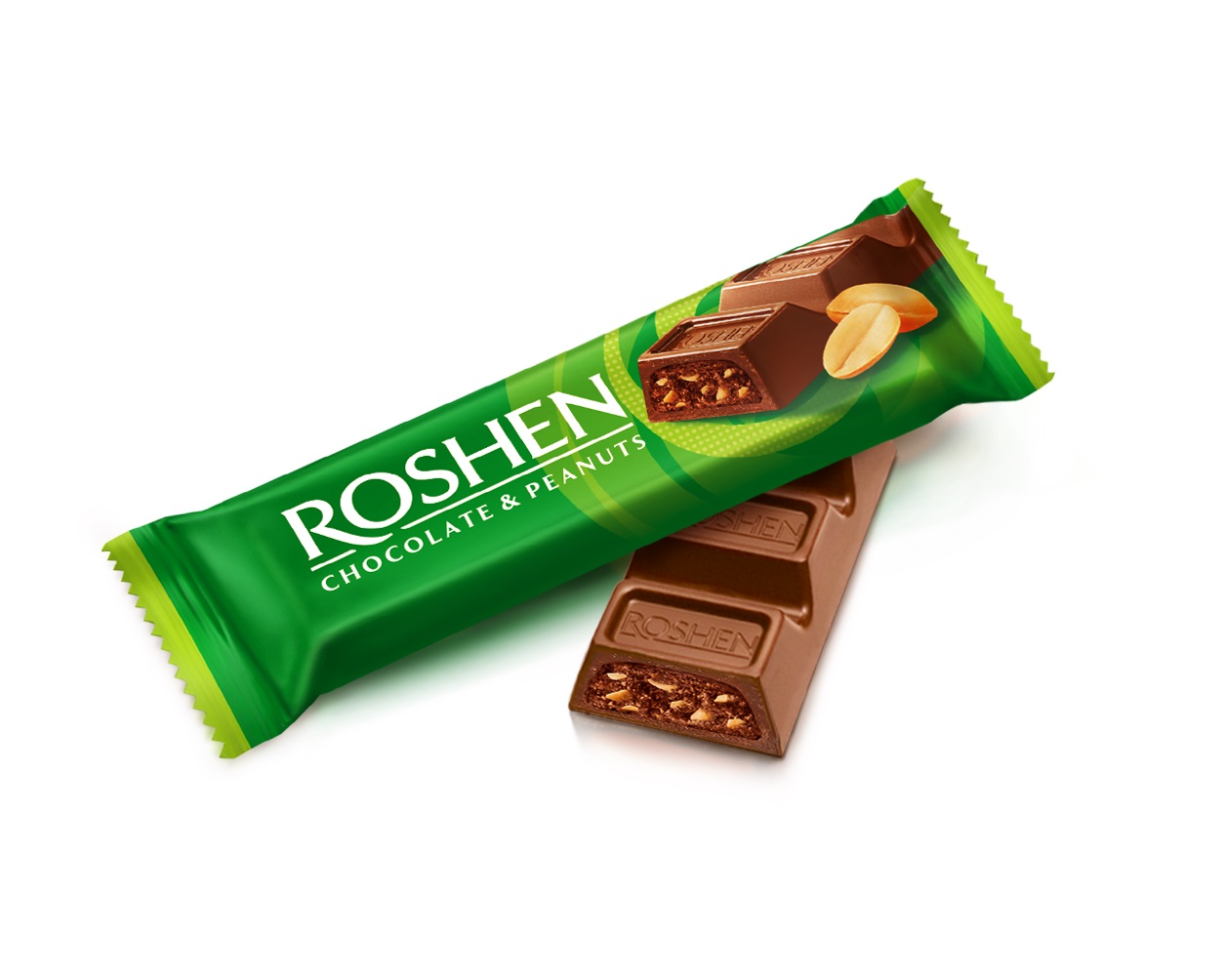 Шоколадный батончик Roshen Chocolate & Peanuts – нежный молочный шоколад с хрустящими жареными арахисами внутри. Приятно сладкий, с ореховым послевкусием, подходит для перекуса, к кофе или в дорогу.