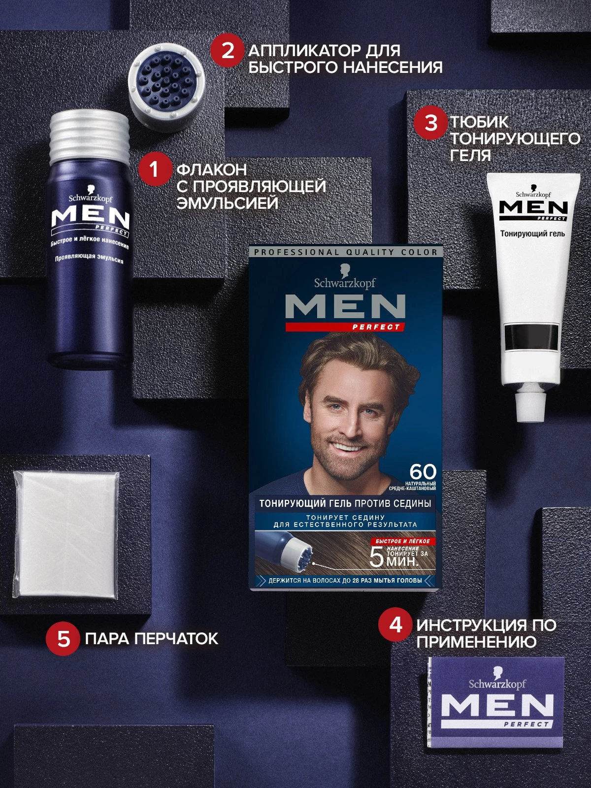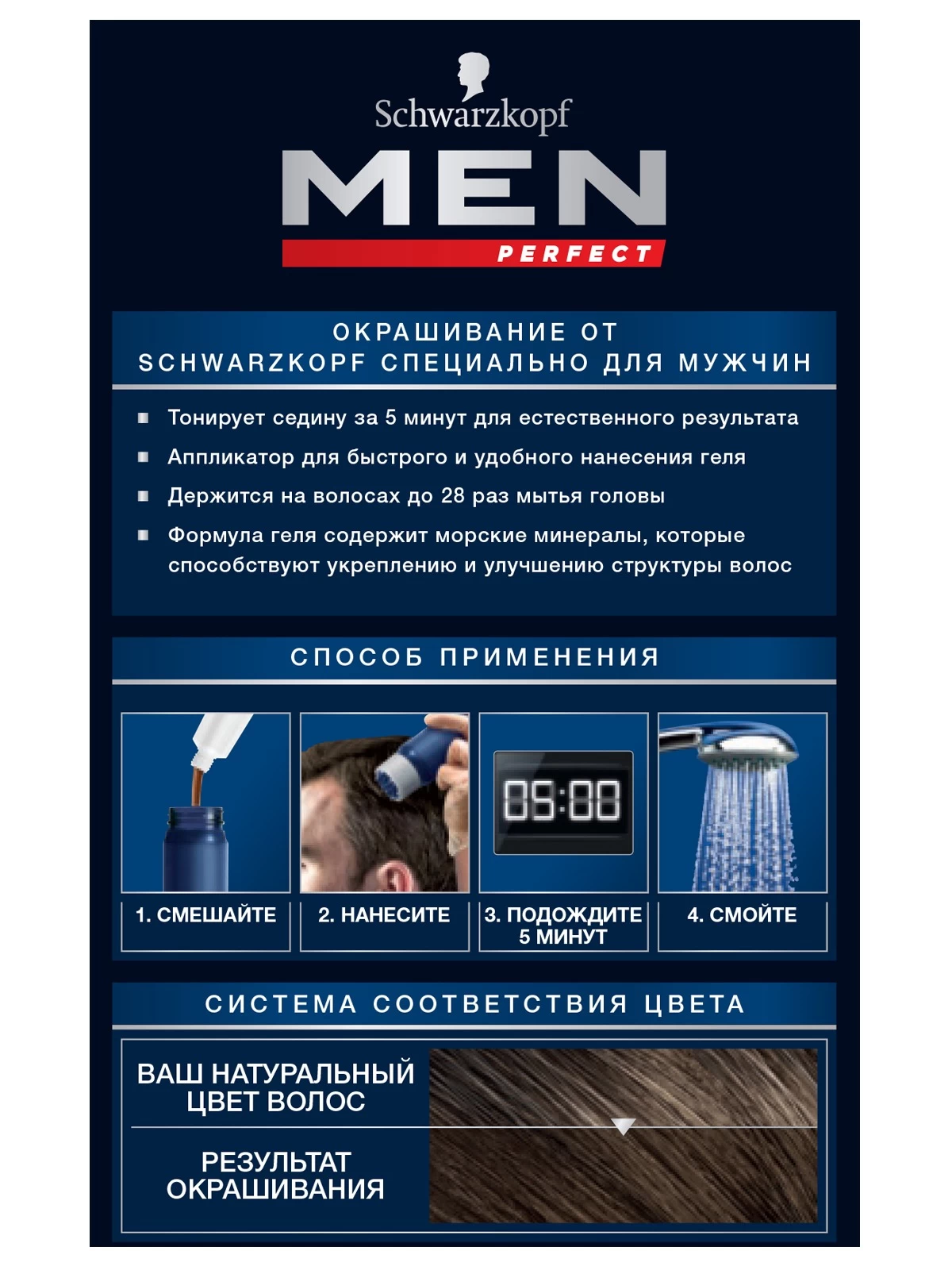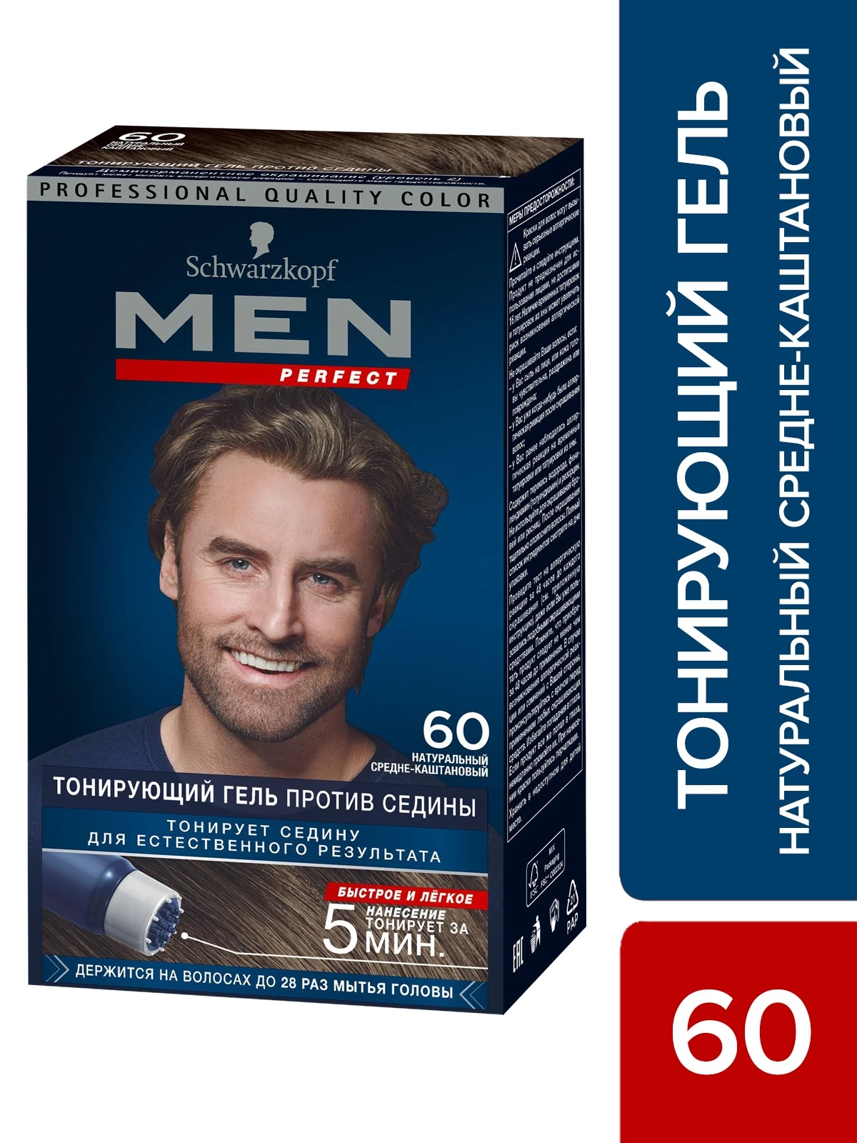Тонирующий гель Men Perfect 60 разработан для мужчин, которым необходимо быстро замаскировать первые седые волоски. В зависимости от количества седины выбирайте время обработки, чтобы добиться оптимального естественного результата, который надолго сохранится.
