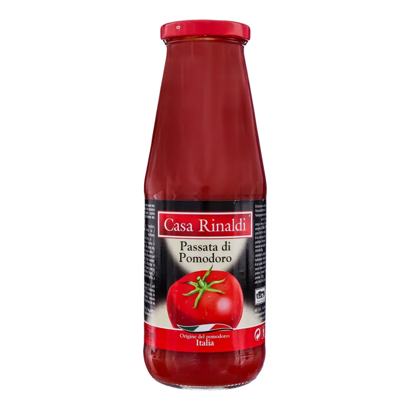 Томатное пюре или passata di pomodoro — измельченная мякоть помидоров в собственном соку. Для приготовления пюре используются только самые спелые помидоры, собранные в конце лета. Пассата — это показатель мастерства итальянской хозяйки, поэтому ее рецепт передается из поколения в поколение. Пассата от Casa Rinaldi — пюре, приготовленное по старинным итальянским традиционным рецептам с сохранением всех важнейших нюансов этого соуса.