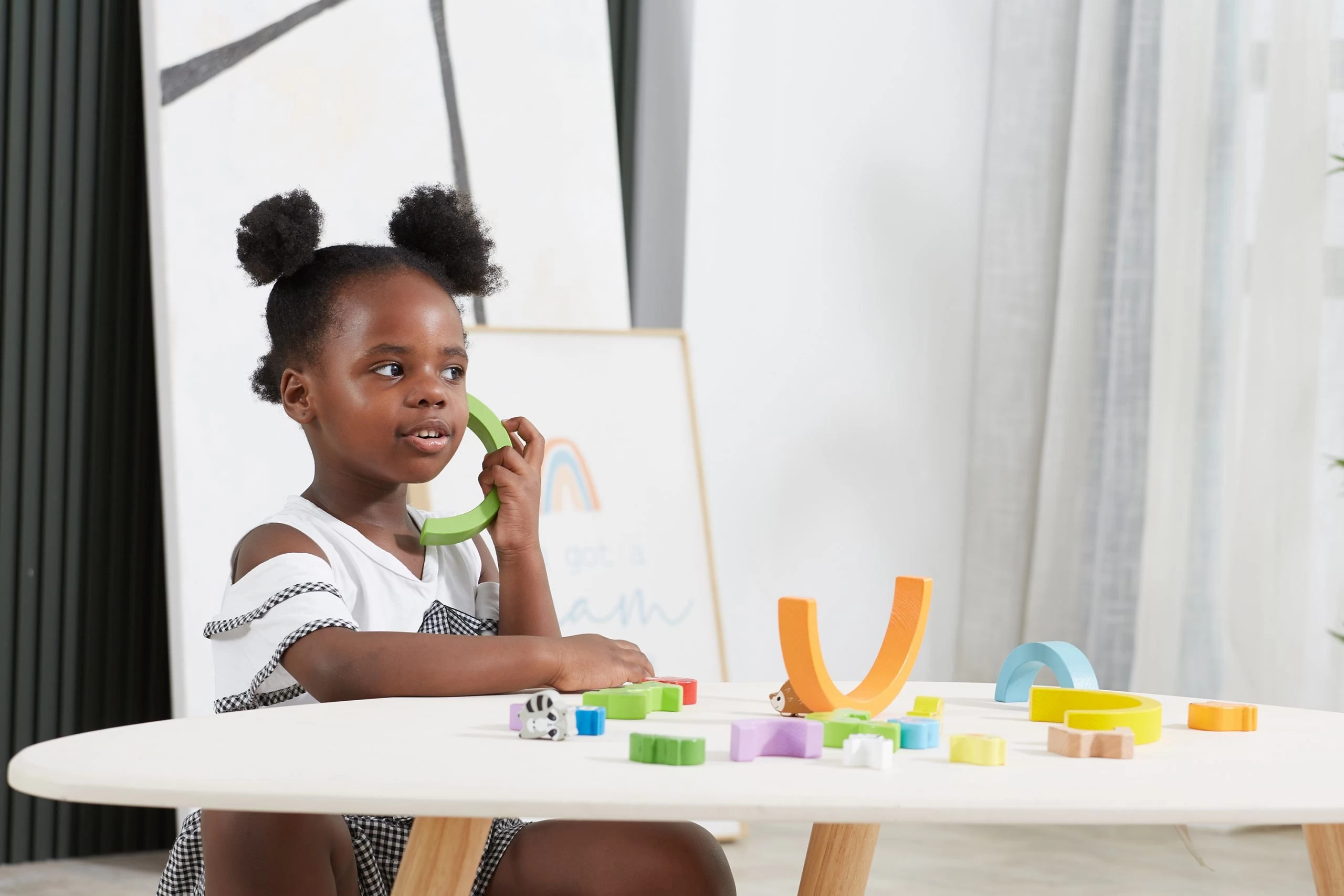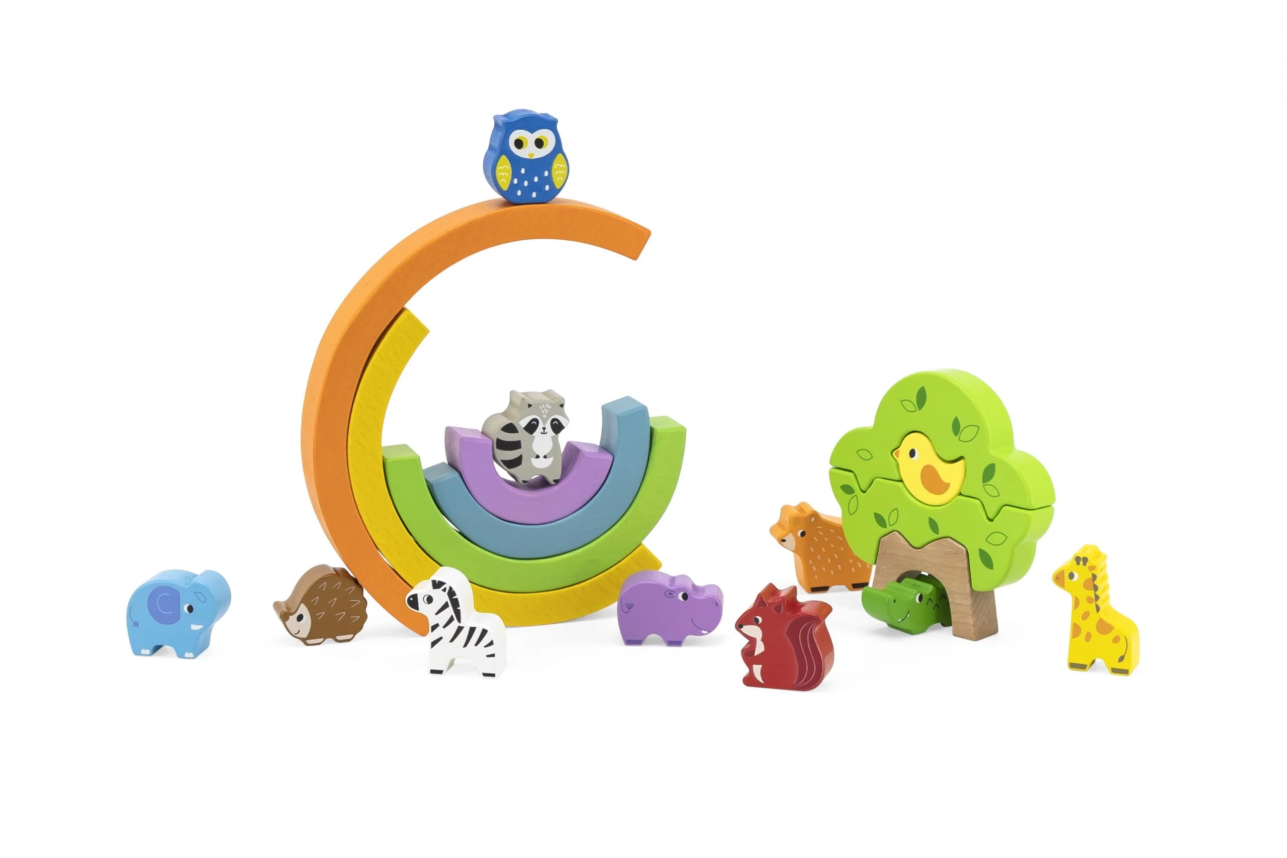 В наборе 19 разноцветных блоков: 5 полукругов радуги, 11 фигурок зверят, 3 части дерева. Их необходимо сложить так, чтобы постройка была устойчива.
