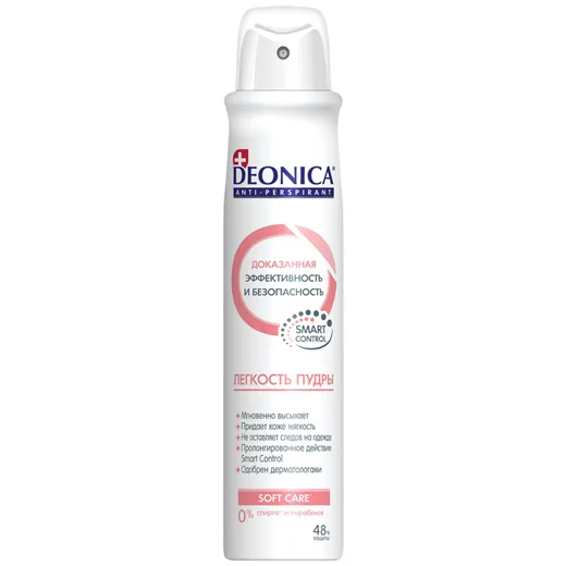 Гипоаллергенный антиперспирант нового поколения Deonica разработан специально для людей с чувствительной и сухой кожей, склонной к раздражениям. Эффективность дезодоранта подтверждается многочисленными испытаниями в независимых европейских лабораториях, а уникальная формула состава одобрена ведущими дерматологами Европы.