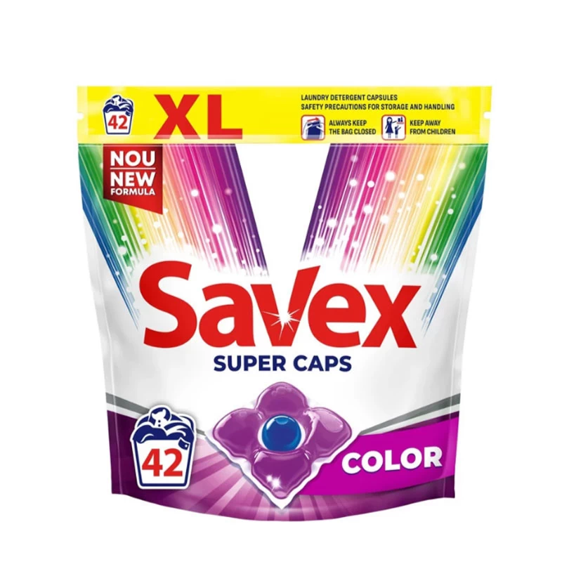 Savex Super Caps Color делает вашу одежду безупречно чистой. Суперконцентрированная формула удаляет стойкие пятна даже в холодной воде и обеспечивает длительную свежесть. Упростите свою рутину стирки, используя готовые дозированные капсулы, которые легко и эффективно обеспечивают превосходные результаты.