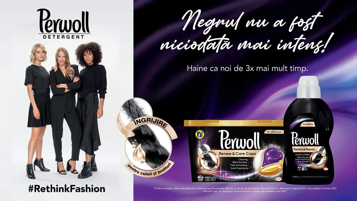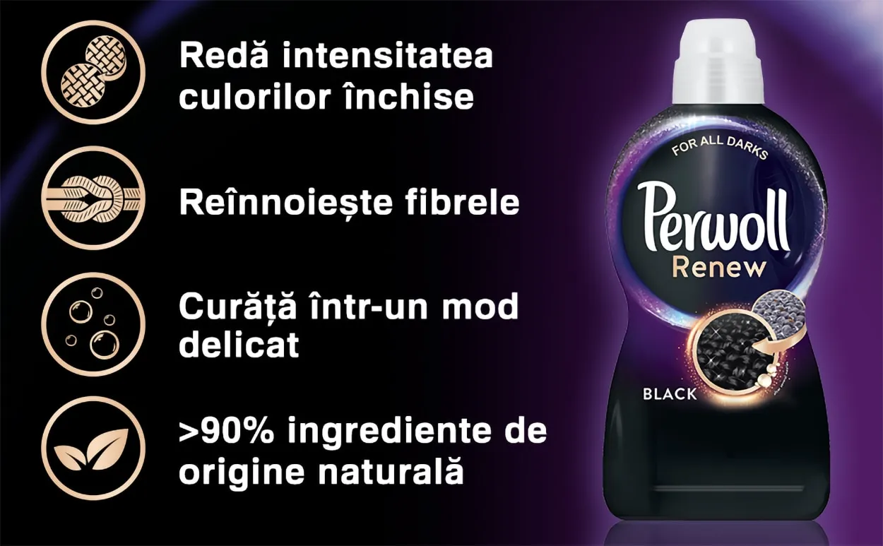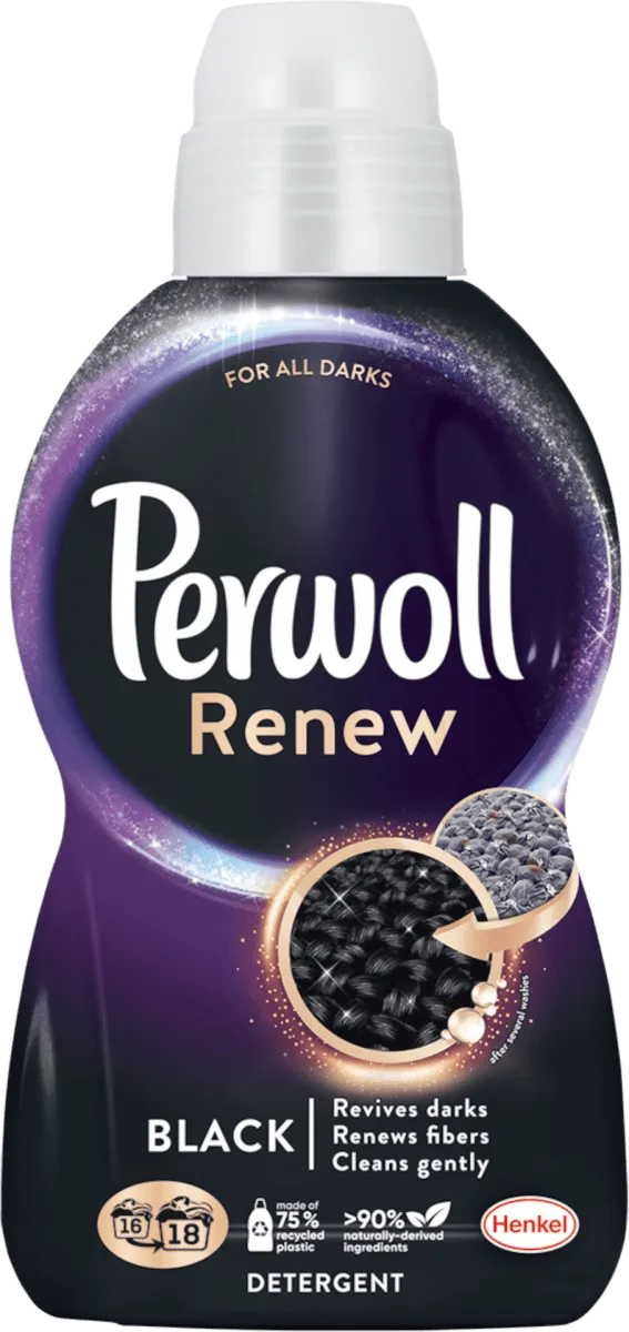 Откройте для себя стиральный порошок Perwoll Renew Black - идеальный уход за черной одеждой и темными цветами. Новое моющее средство обеспечивает бережную очистку и придает блеск темной одежде. Благодаря своей формуле средство восстанавливает интенсивность темных цветов, разглаживает и укрепляет текстильные волокна, так что одежда выглядит как новая с первой стирки. Моющее средство содержит более 90% ингредиентов натурального происхождения