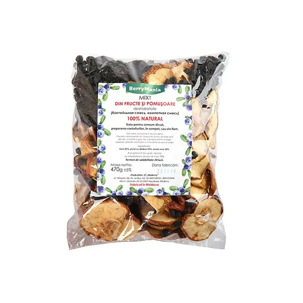 100% натуральный продукт, готов к употреблению. Разноообразный состав является гарантией насыщенного вкуса, рассчитан на 8 л напитка. Изготовлен из фруктов и ягод, выращенных молдавскими фермерами. Его можно использовать в мюсли, компоте, глинтвейне или коктейлях, а также в разнообразных кулинарных рецептах. Не содержит сахара, консервантов и других добавок.