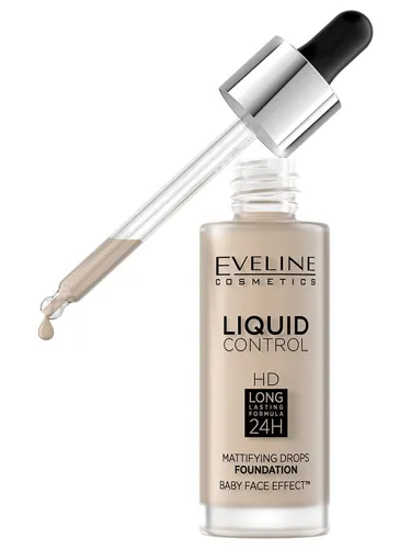 Инновационная тональная основа жидкая Eveline Cosmetics Liquid Control HD Mattifying Drops Foundation нового поколения благодаря жидкой, нежирной и чрезвычайно легкой консистенции обеспечивает максимальный естественный эффект «второй кожи».